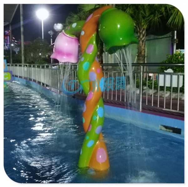水上樂園設備戲水小品雙花噴水LT-SH17115整體設計為兩株互相纏繞的花藤,頂上是兩個噴水花蕾。讓孩童仿佛置身于童話王國,蕩漾在花海的世界里。讓孩子在愉快的玩耍過程中放松身心,并對鮮花植物加深認識。特別適合水上樂園設備親子戲水樂園兒童戲水池中的一款輔助設備,大人小孩一起玩,還能增加家庭親子感情。創建和睦家庭關系。同時也可以跟周圍的兒童水上樂園設備組成景觀點綴,增添熱鬧有趣的氣氛;形成一種親子水上樂園的氛圍!