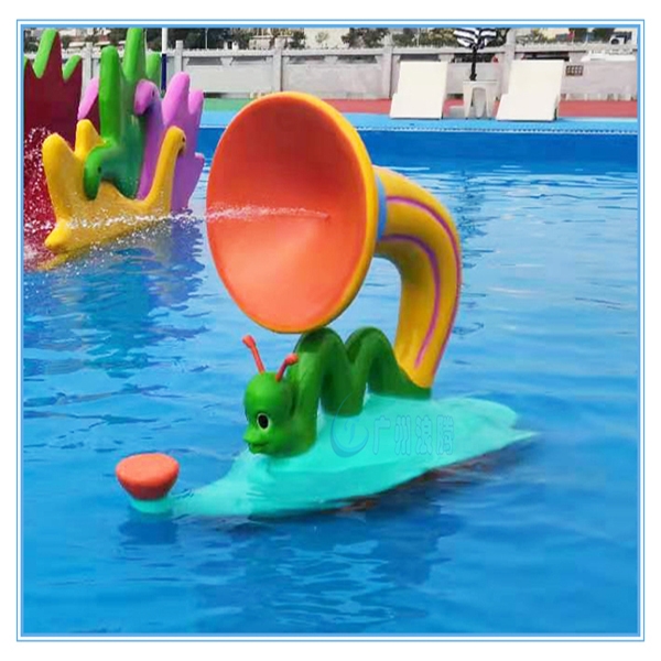 水上樂園設備戲水小品噴水喇叭蟲LT-XP100整體設計為一只可愛的小蟲子扛著一個大喇叭趴在一片綠葉上,就好像對這片綠葉宣告了主權。放在水池中,又猶如一葉扁舟,隨風飄蕩,載著小蟲,尋找媽媽。